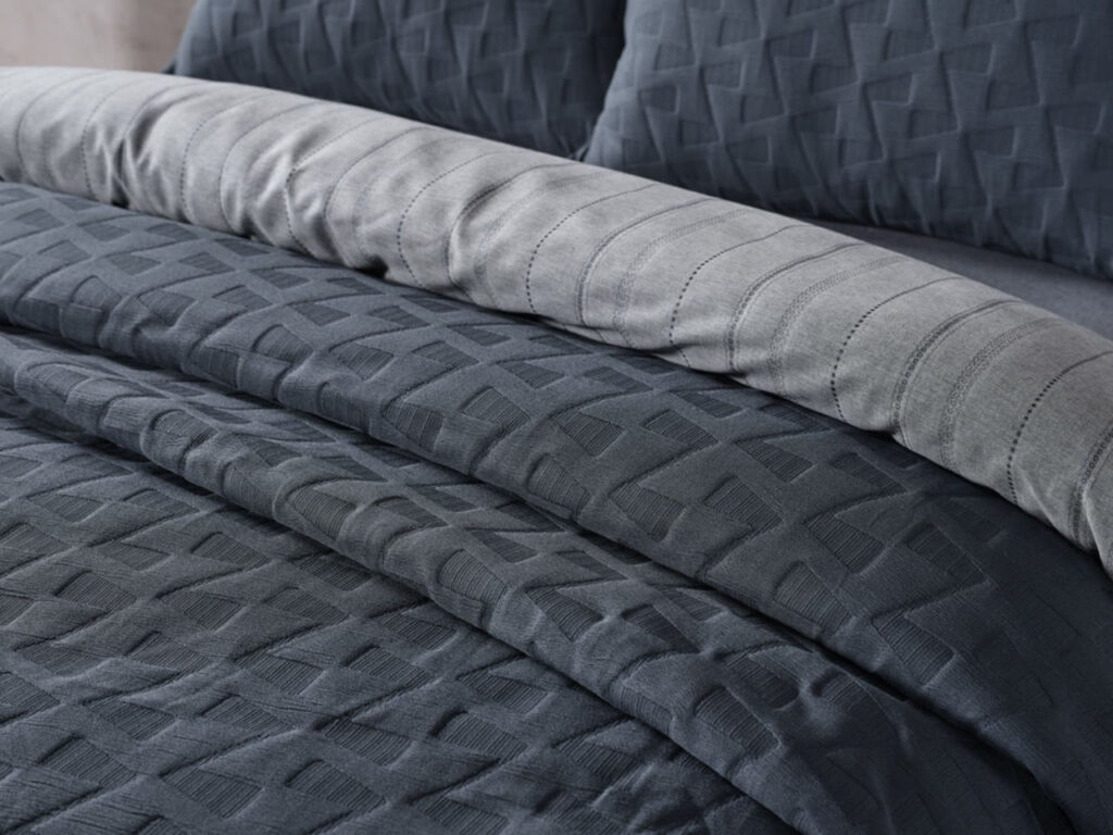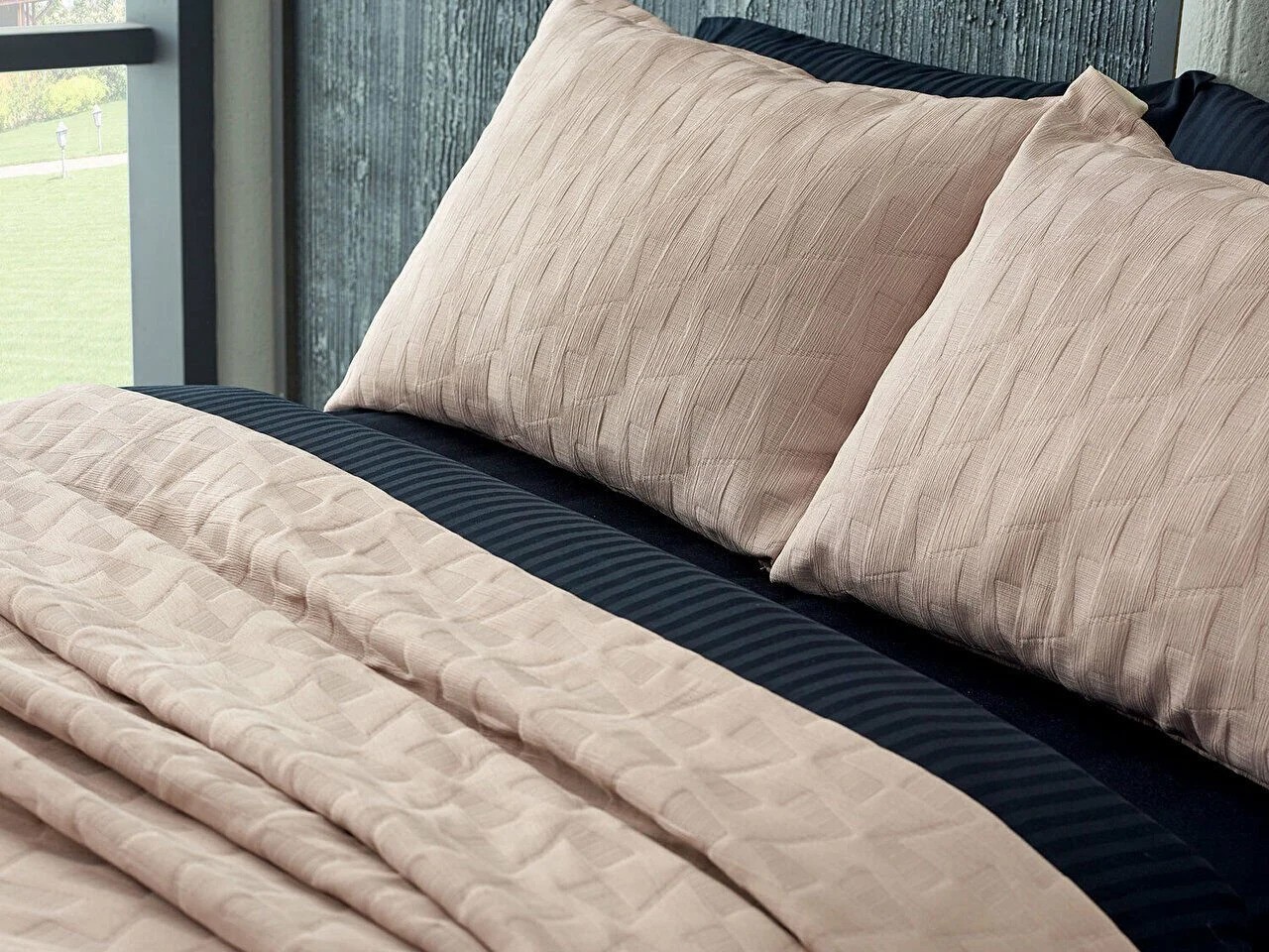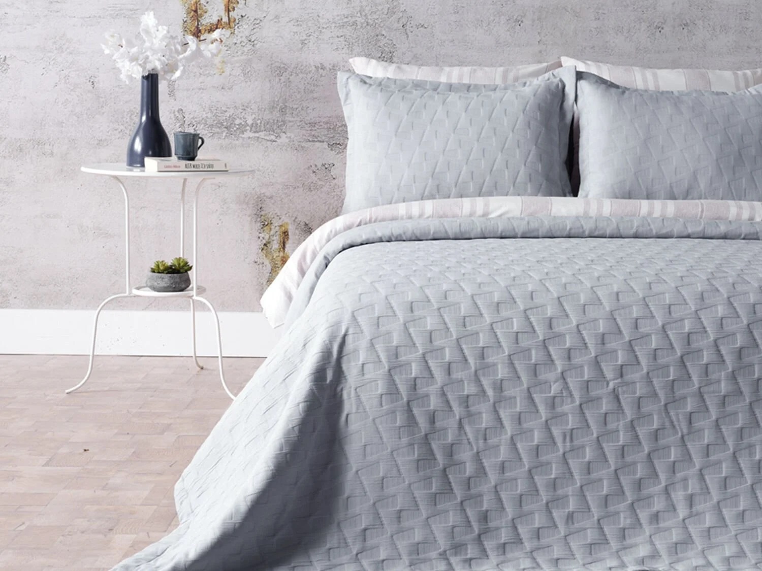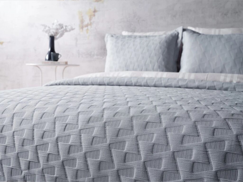 Transformă-ți dormitorul într-un spațiu rafinat și relaxant cu această cuvertură matlasată, confecționată din 100% poliester de înaltă calitate. Designul geometric subtil și textura moale oferă un aspect modern, completând perfect orice stil de amenajare interioară.