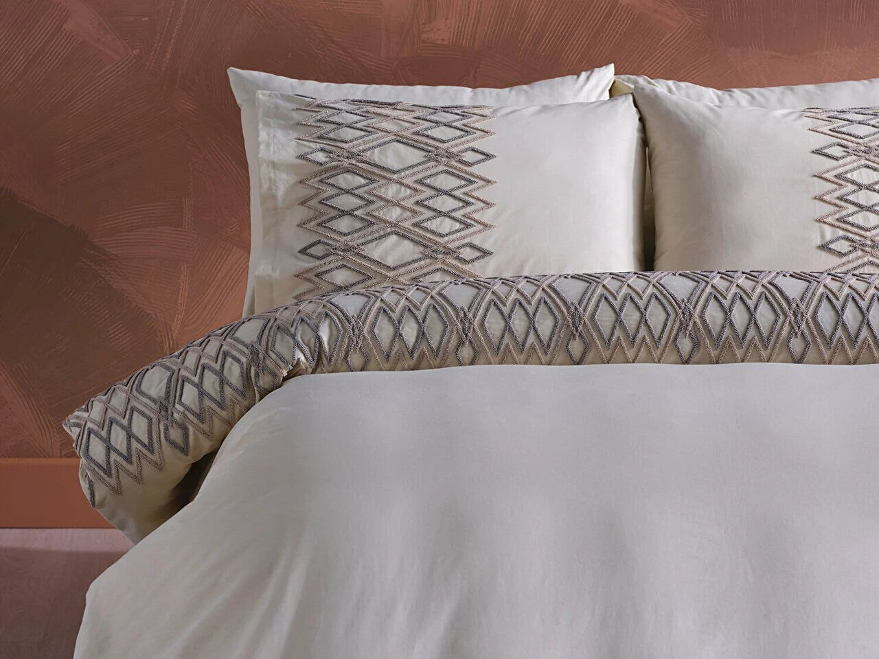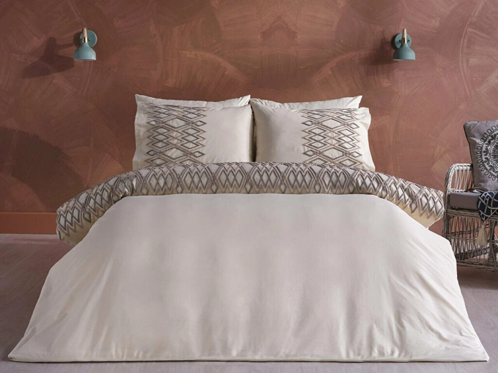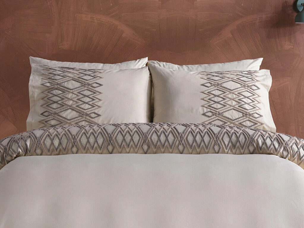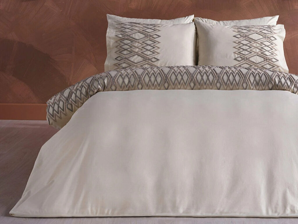 Broderia perforată, în stil geometric, oferă un aspect foarte texturat și bogat vizual, făcut din bucle. Conceput în tonuri de bej și maro pe țesătură ecru, setul de husă de plapumă cu broderie Capitol va fi indispensabil clienților noștri care nu renunță la detaliile de broderie din dormitoarele lor.
