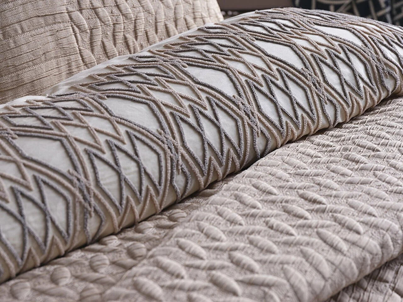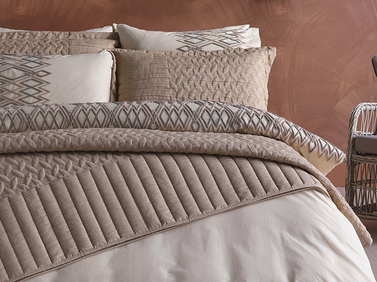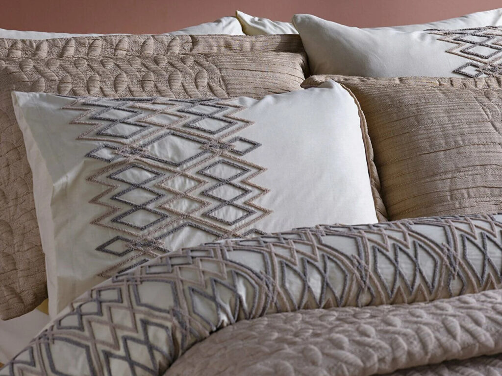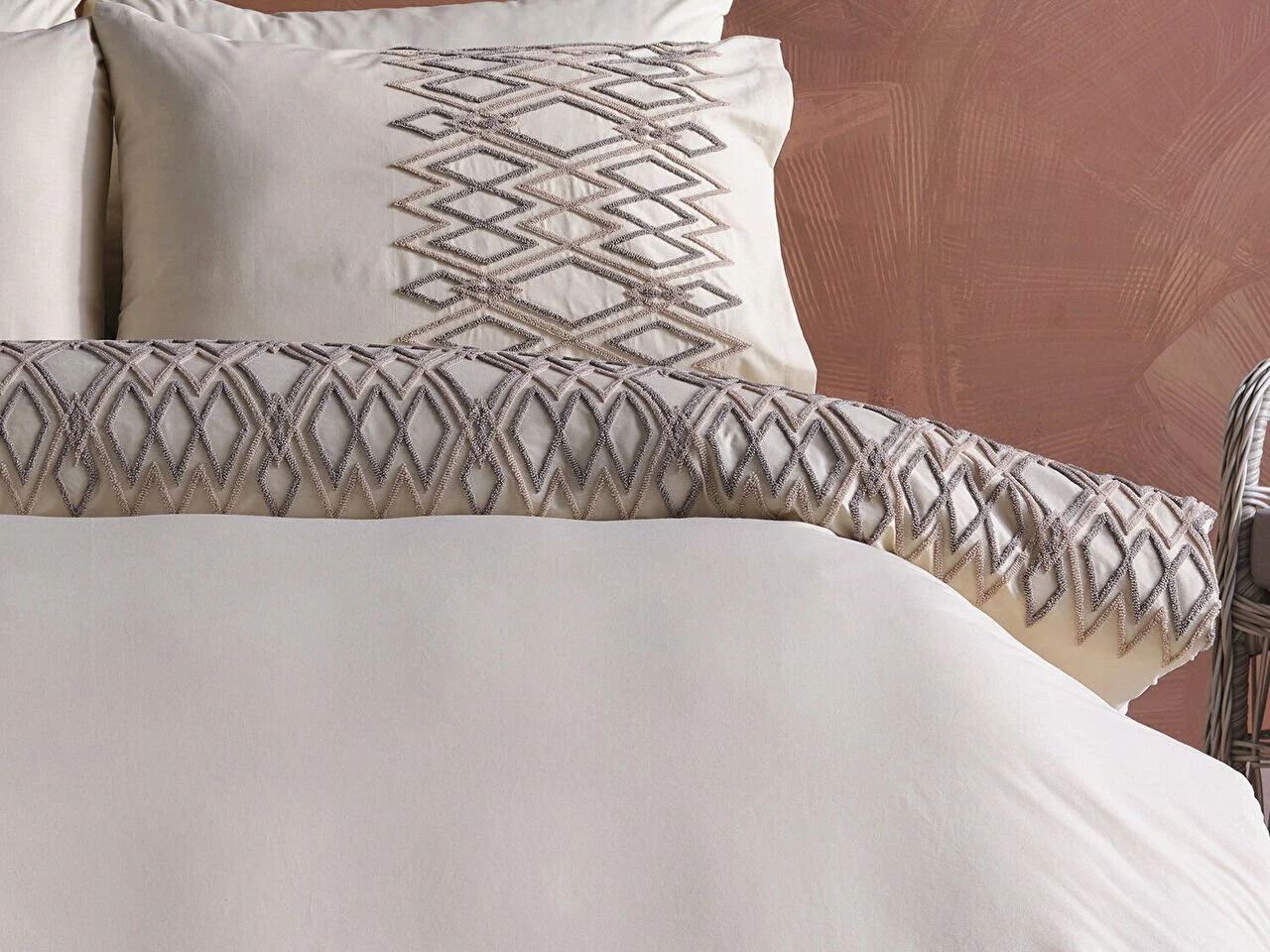 Broderia perforată, în stil geometric, oferă un aspect foarte texturat și bogat vizual, făcut din bucle. Conceput în tonuri de bej și maro pe țesătură ecru, setul de husă de plapumă cu broderie Capitol va fi indispensabil clienților noștri care nu renunță la detaliile de broderie din dormitoarele lor.
