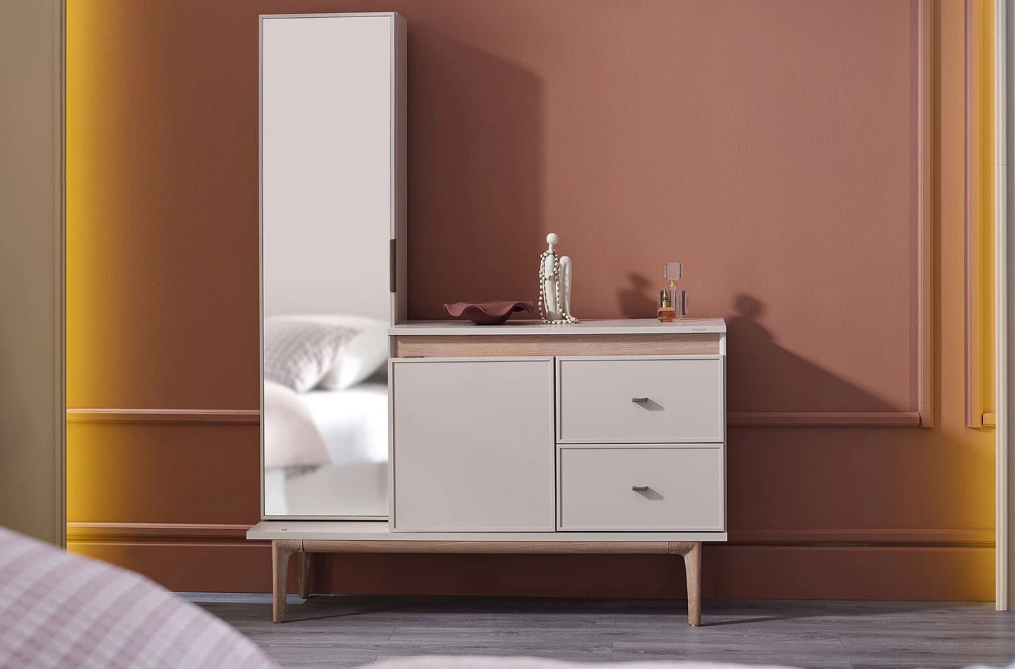 Masa de toaleta Valenty cu oglinda inalta si finisaj bej intr-un stil modern si minimalist