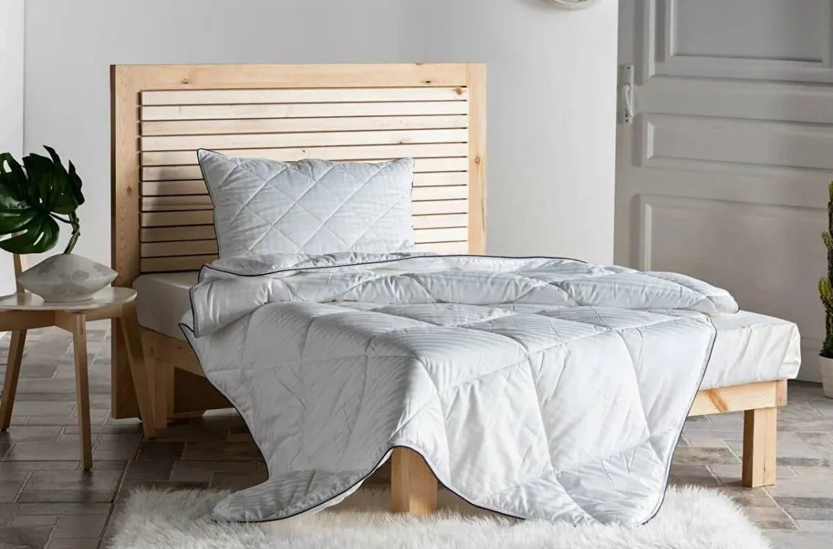 Învelișul exterior 100% natural are o țesătură foarte strânsă și proprietăți de absorbție a umezelii. Umplutură specială, subțire, cu fibre de microgel îi permite să își mențină volumul timp de mulți ani și oferă un somn sănătos.