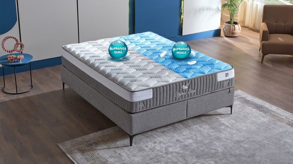 Practic, pe scheletul aceluiași miez de arcuri, s-ar putea folosi arcuri cu tensiune diferită de-o parte și de alta, sau adăugarea de straturi de rigidizare pe o jumătate. Cea cu duritate mare (“partea dreaptă oferă o suprafață dură”) probabil are spumă de confort mai subțire sau mai densă, plus arcuri cu sârmă mai groasă, în timp ce partea moale (“partea stângă oferă o suprafață mai moale”) are un strat suplimentar de spumă adaptivă sau arcuri cu tensiune mai mică. Totul fără vreo separare vizibilă – la suprafață salteaua arată uniformă, dar “sub capotă” are aceste diferențe.