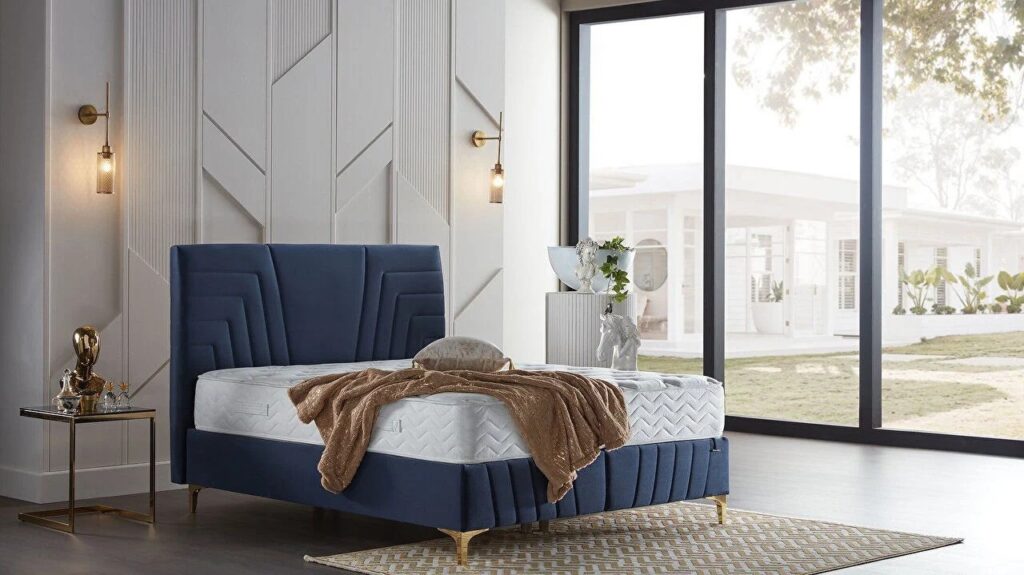 Кровать Toria со cпециальным дизайном изголовья линейной формы, расположенная под углом, предлагает множество вариантов ножек и тканей, которые создадут гармоничный