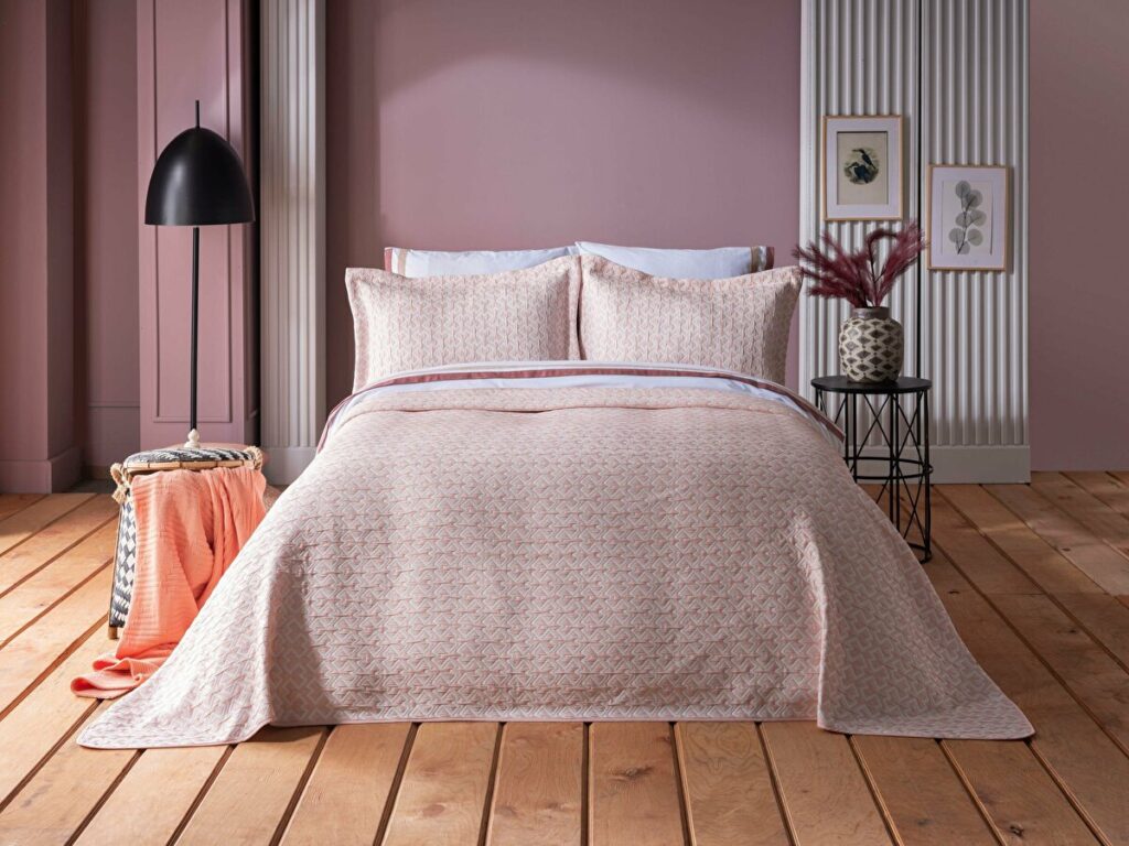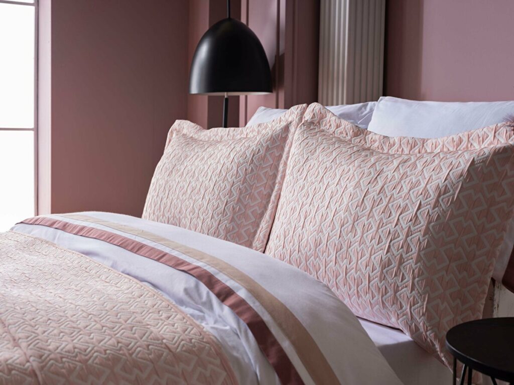 Набор Festa, выполненный из мягкого и приятного на ощупь материала, впечатляет рельефным геометрическим узором и нежным пудрово-розовым оттенком, придающим комнате утончённую и тёплую атмосферу.