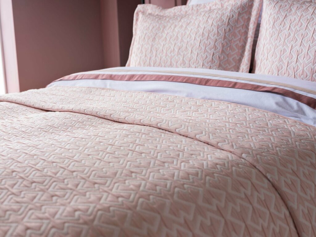 Набор Festa, выполненный из мягкого и приятного на ощупь материала, впечатляет рельефным геометрическим узором и нежным пудрово-розовым оттенком,