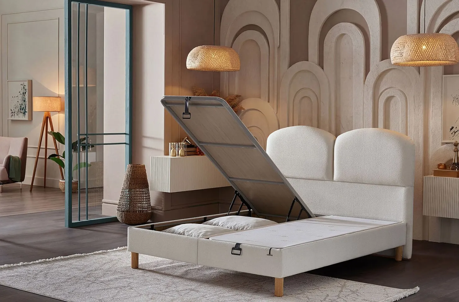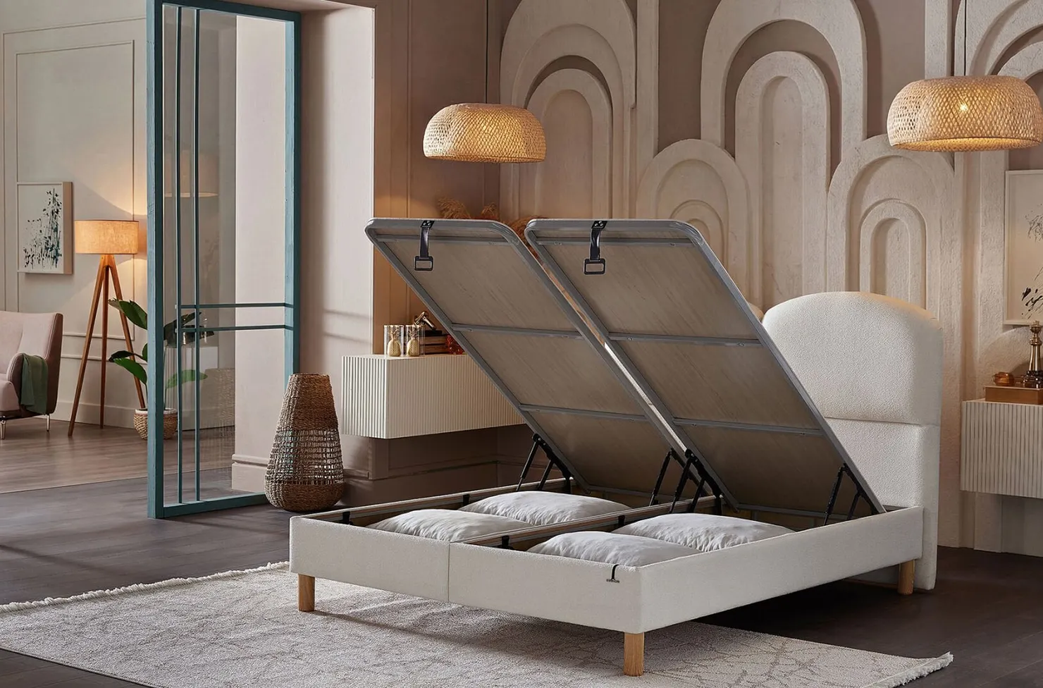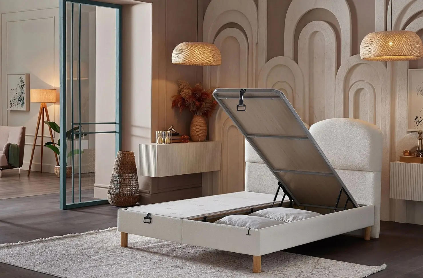Благодаря своей конструкции со встроенным ящиком для хранения, кровать Pure Soft предлагает практичное решение для организации спальни. Просторное внутреннее пространство позволяет легко хранить кипы, одеяла, постельное белье или сезонные вещи, помогая поддерживать чистоту и простор в помещении. Система открывания обеспечивает быстрый и легкий доступ для ежедневного использования, идеально подходящий даже для спален с ограниченным пространством.