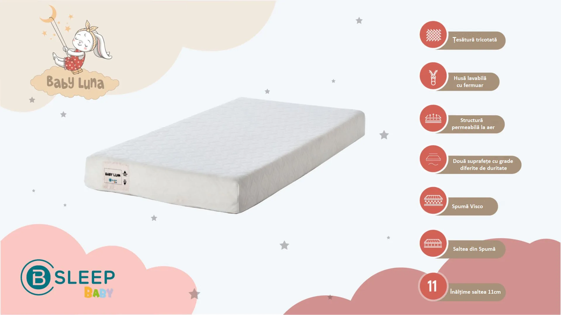 Матрас Baby Luna обеспечивает дополнительный комфорт и удобство для малышей благодаря своей вспененной структуре. Трикотажная ткань достаточно мягка для чувствительной кожи младенцев, отличается влагостойкостью и воздухопроницаемостью.