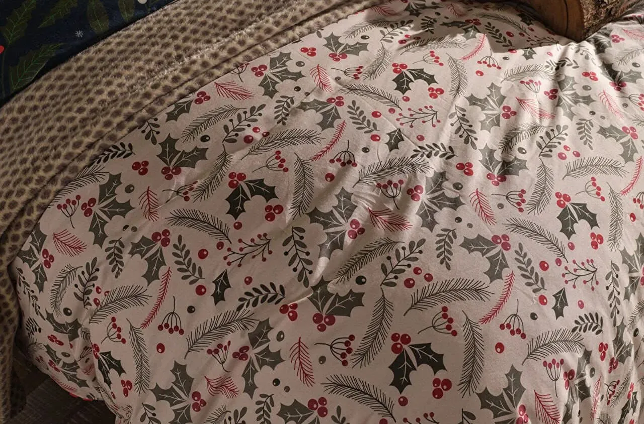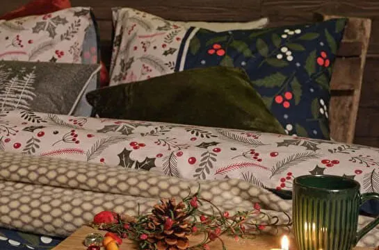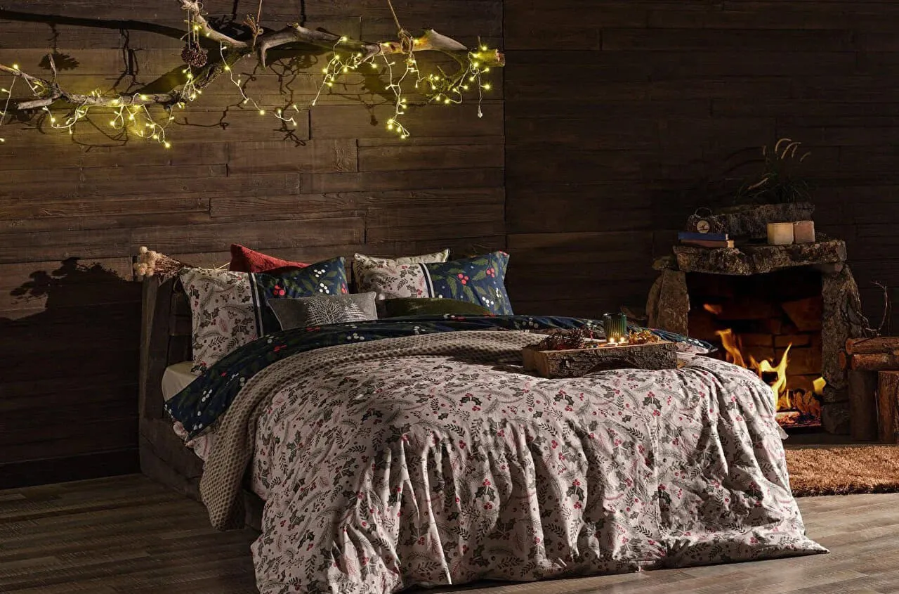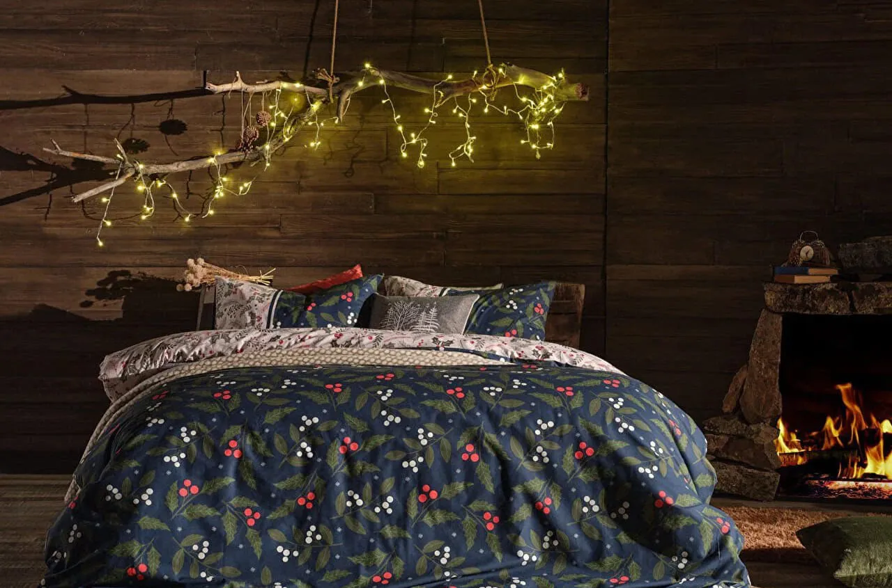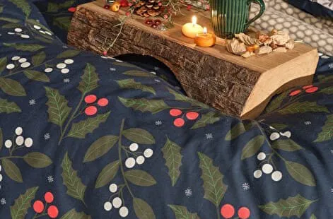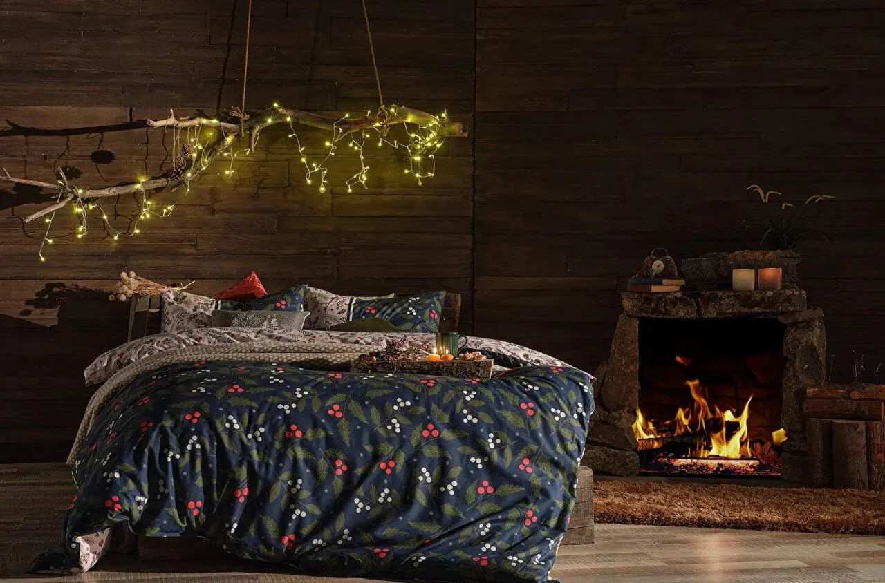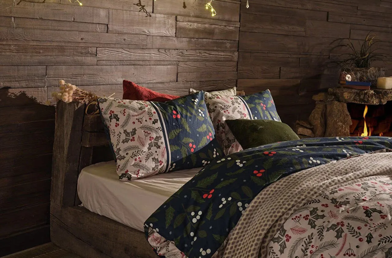 С изысканным принтом на тёмно-синем фоне, украшенным зелёными листьями и красно-белыми лесными ягодами, постельное бельё приносит в комнату очарование зимы и дух Рождества. Это идеальный выбор для стильного сезонного декора и для комфортного, расслабляющего сна.