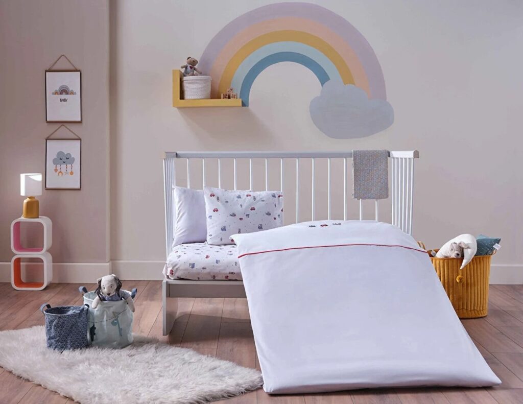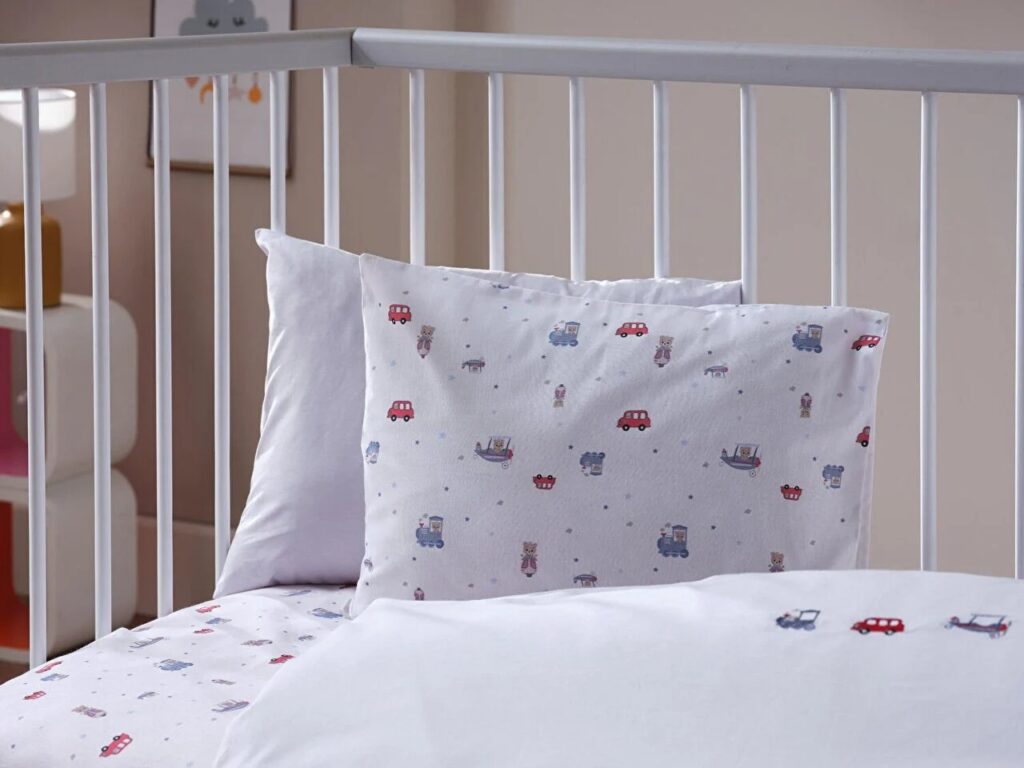 Комплект детского постельного белья с морским принтом нежных цветов обеспечивает комфортный сон и добавляет красоты благодаря вышивке на мягкой ткани из 100% хлопка.